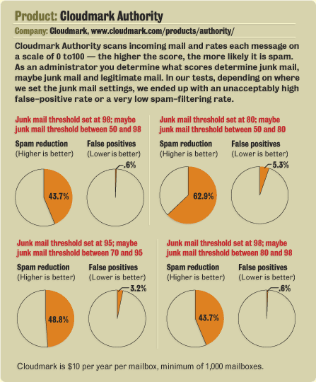 As Cloudmark Authority peers at an incoming mail stream, it determines a score from 0 to 100 for each message, with the higher the score, the more likely it is spam. Depending on the score, it takes one of five actions: quarantine the message locally in a mailbox on the Cloudmark Authority server; drop and delete it entirely; return the message to the sender; tag the subject line (such as adding "[SPAM]") and send it along to the corporate mail server; or, add a header tag to the message (such as "X-Spam") and send it along.