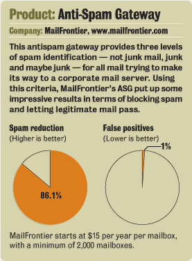 MailFrontier did an outstanding job of picking out spam - detecting 86% of the spam fired at it over seven days. But its dependence on Exchange and Outlook in this first version of the product and the requirement to add software to end users' systems, as well as some holes in its whitelist management strategy, counteract its superior spam identification algorithms.