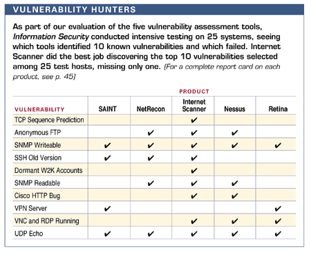 Many security managers first see the results of a vulnerability analyzer when a consultant drops an annual audit report on their desk. But as January's SQL Slammer worm reminded us, exploits aren't timed to coincide with audits. Like Code Red in 2001, Slammer exploited a well-documented vulnerability; and as with Code Red, a patch was available well before the worm struck. The point is, admins need an up-to-date picture of what's running on their network, where the holes are, and what's patched and what's not. We tested five1 tools to see which had the best detection engines and reporting tools, and which did the best job managing the data from their findings: