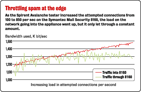 Answer: It's not perfect but pretty close. We sent large volumes of mail through the Mail Security 8160 at a rate of 850 messages per second. We divided our senders into three categories: 0%, 50% and 100% spammers (see how we did it ). The 100% spammers were heavily throttled, as we had planned, getting just a few messages per hour through to the mail server. Although the 0% spammers were not throttled, the Mail Security 8160 was stressed by the load and did drop a few messages that it shouldn't have. When we tested to establish a base performance level without any spam and without any added real-world latency, the Mail Security 8160 didn't drop any messages it shouldn't have. With the 50% spammers, the box throttled the traffic, but not exactly in coordination with the policy we had selected.